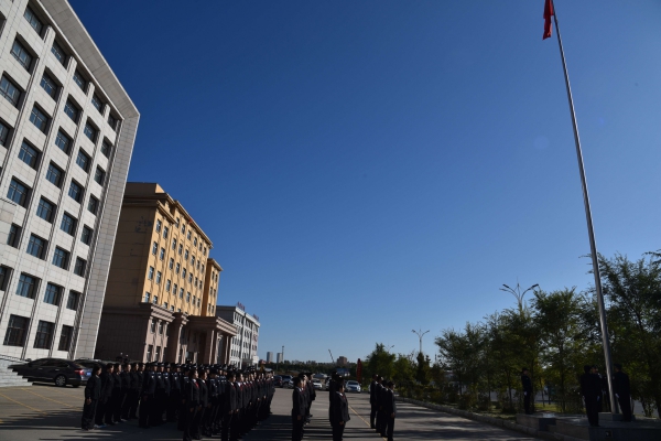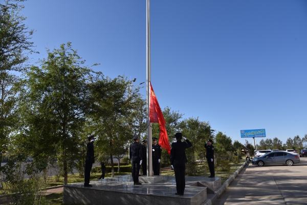 八点整,护旗手迈着正步护卫着国旗入场,在众人的注目下,伴着庄严的国歌《义勇军进行曲》,鲜艳的五星红旗冉冉升起。全院干警整齐队列,怀着无比激动的心情,以崇高的敬礼向国旗、向伟大祖国致敬。