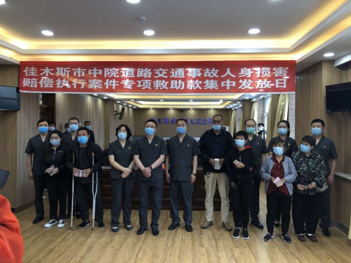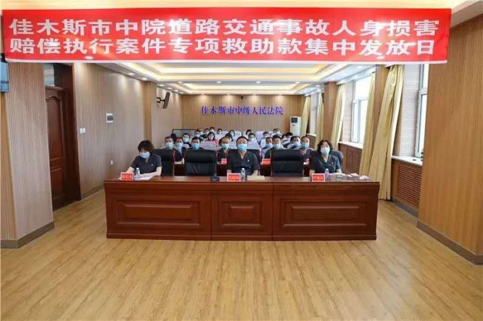 2020年6月17日上午,随着黑龙江高院党组成员、执行局局长王启胜按下“启动键”,全省法院道路交通事故人身损害赔偿执行案件专项救助款集中发放日活动正式启动。在佳木斯中院举办的集中发放现场,富锦法院的三名交通事故受害人领取了道路交通救助款15万元。