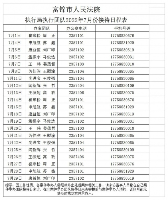 能力作风建设年 | 富锦市人民法院执行团队2022年7月份接待日程表