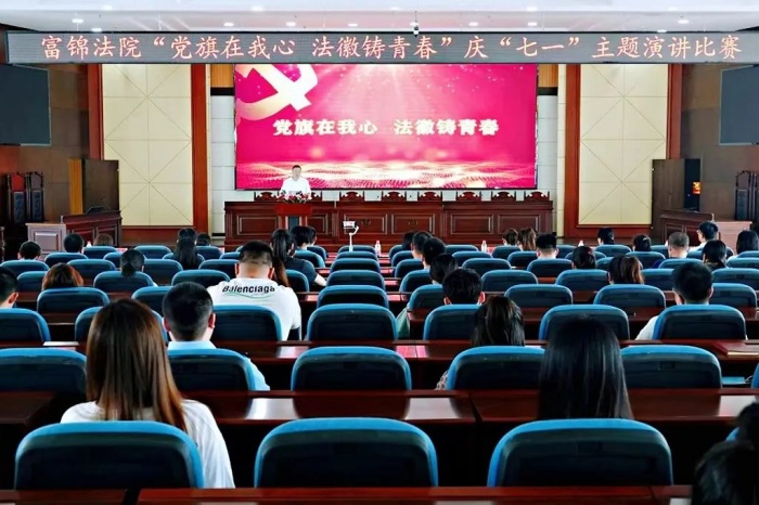 在伟大的中国共产党诞辰101周年之际,富锦法院组织开展“党旗在我心 法徽铸青春”主题演讲比赛,引导干警增强党性观念,坚定理想信念,特邀富锦市委组织部组织二组组长曲洪飞与院内其他6名干警担任评委,党组书记、院长刘大伟、党组成员及全体干警观看比赛。