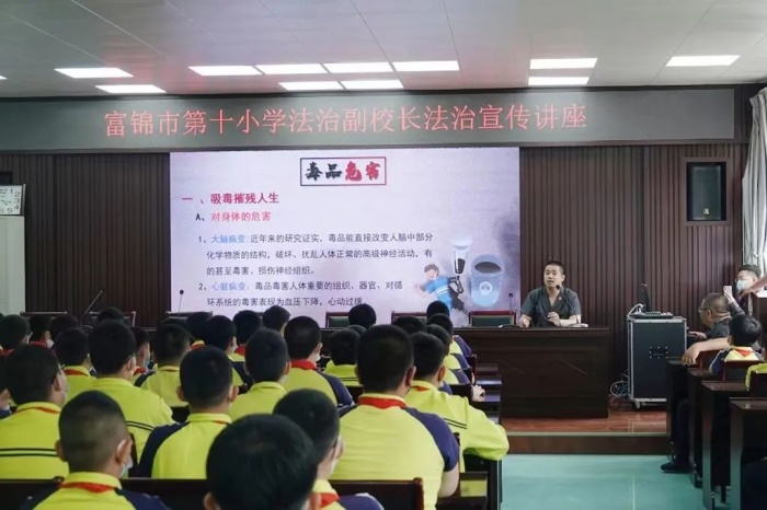 为增强青少年抵制毒品的意识和对毒品危害的认识,维护和谐校园环境,近日,富锦法院政治部干警赵清元前往市第十小学,作为市第十小学法治副校长,为该校100余名师生带去一堂禁毒宣传课。