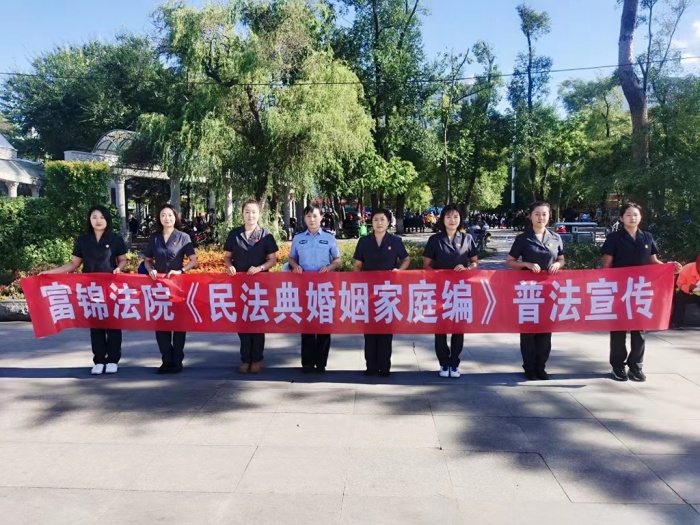 为进一步增强人民群众的法律意识,促进幸福美满婚姻家庭关系,构建和谐社会筑牢家庭基石,8月26日,富锦市人民法院妇女委员会组织部分女干警开展以“巾帼心向党,'典'亮千万家”为主题的《民法典》《婚姻法》普法宣传活动。