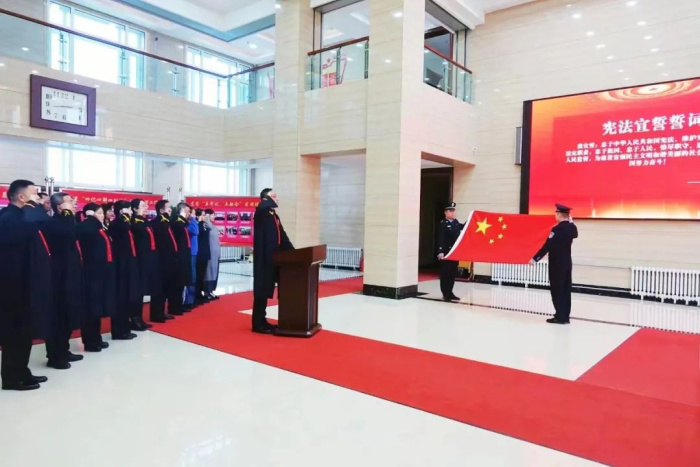 宣誓仪式开始,全体肃立,奏唱《中华人民共和国国歌》。之后,领誓人左手抚按《中华人民共和国宪法》,员额法官们身着法袍,右手齐耳握拳,面向红旗庄严宣誓,铿锵有力的誓言久久回响,激荡人心。