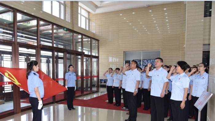 课前,牛雄飞同志首先带领全体党员干警重温了入党誓词。面对着鲜红的党旗,全体党员右手握拳,郑重宣誓“我志愿加入中国共产党,拥护党的纲领,遵守党的章程,履行党员义务,……随时准备为党和人民牺牲一切,永不叛党”。响亮的誓言使全体党员再次感受到党性的洗礼。