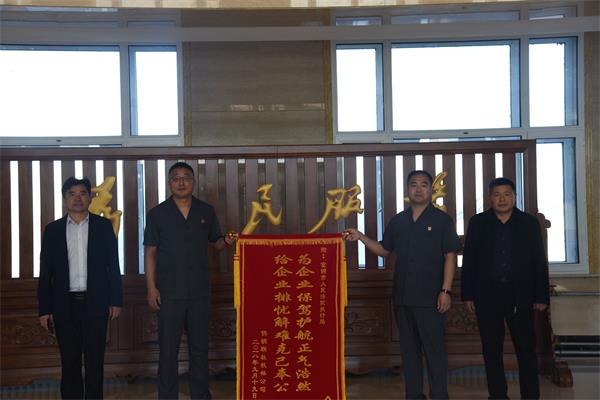 2018年9月19日,富锦市供销社主任一行4人把写有“为企业保驾护航正气浩然、给企业排忧解难克己奉公”的锦旗送到富锦法院执行局。