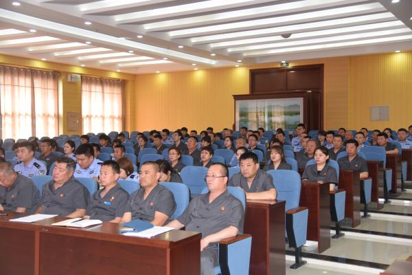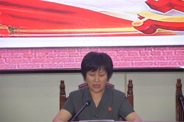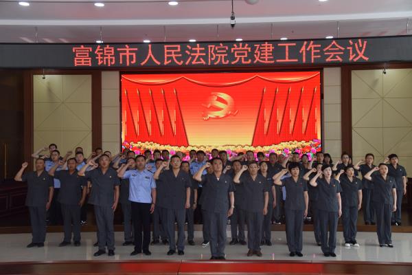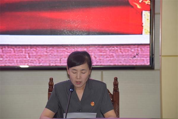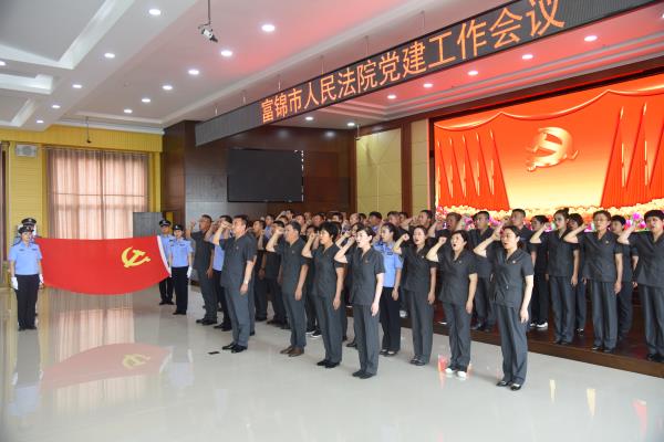 会前,在院党组书记、院长牛雄飞同志的带领下,全体党员干警再次重温入党誓词,面对鲜红的党旗,全体党员郑重地举起右拳以铮铮誓言表达对党对人民的庄严承诺。